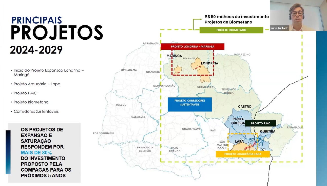 Na sequência, foram detalhados os principais projetos previstos para o ciclo de investimentos entre 2024 e 2029, com ênfase na expansão da rede de distribuição no estado. Entre os destaques estão os projetos nas regiões de Londrina e Maringá, a ampliação da infraestrutura em Curitiba e Região Metropolitana, além da implantação de corredores sustentáveis voltados ao abastecimento de frotas pesadas.