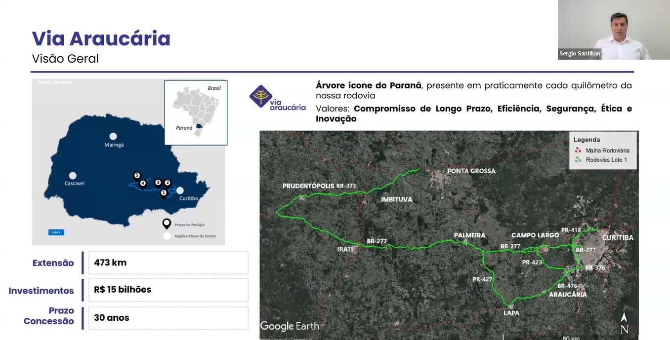Entre as ações apresentadas, foi destacada a entrega de estruturas de apoio ao caminhoneiro, como o Ponto de Parada e Descanso (PPD) na BR-277, em Irati, além de serviços de atendimento e orientação aos usuários. Na sequência, Santillan abordou o novo contrato da Via Campo, enfatizando os investimentos previstos e a relevância logística do trecho para o estado.